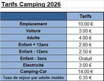 Forfait camping-car pour deux adultes + eau + électricité + vidange (24h Taxe Séjour Incluse) : ...14€...