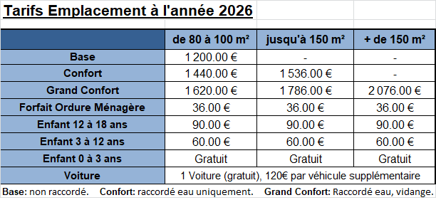 Forfait camping-car pour deux adultes + eau + électricité + vidange (24h Taxe Séjour Incluse) : ...14€...